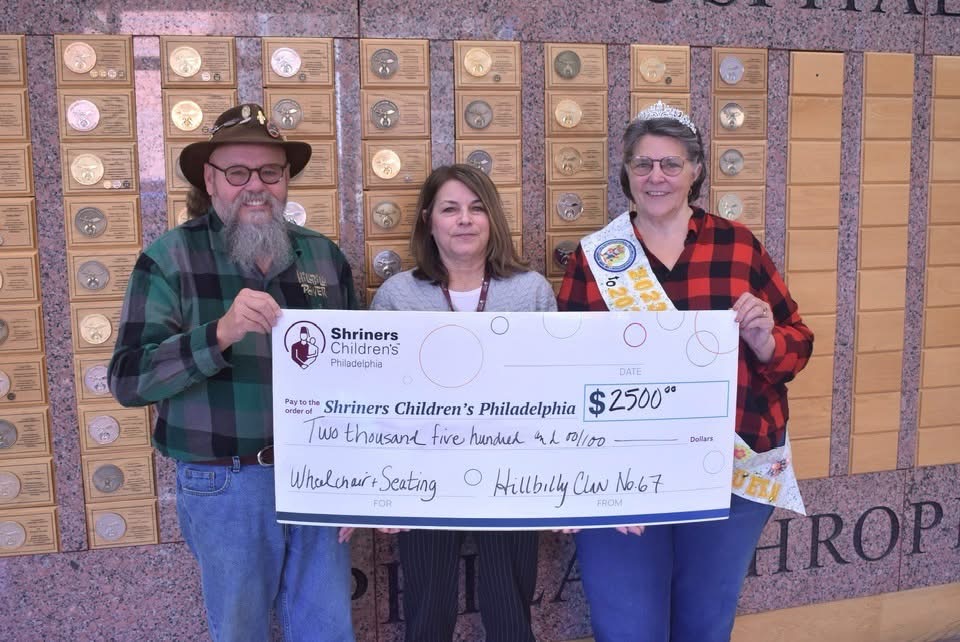 Raban Bruce Mulligan from Hillbilly Clan 67 in Baltimore Maryland presents a check to Keren McNamara, Director of Philanthropy at Shriners Childrens Philadelphia, in the amount of 18,000 dollars. The funds were raised at this years International Hillbilly Convention in August. An additional check in the amount of 12,000 dollars was previously presented to the hospital by the International Hillbilly Queen Louise Mulligan from her fundraising efforts. Congratulations to Clan 67 on your total donation this year of 30,000 dollars to the children of Shriners Hospital. Well done Cuzzins!